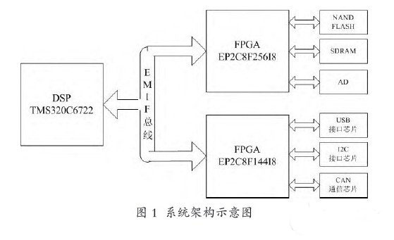 圖1 是所使用的系統(tǒng),DSP芯片通過EMIF接口連接了2 片F(xiàn)PGA,其中EP2C8F256I8 主要負(fù)責(zé)DSP核心處理所需數(shù)據(jù)的交換,連接了FLASH 芯片,SDRAM芯片,A/D 芯片。另一塊FPGA 芯片EP2C8F144I8 負(fù)責(zé)與外部通信,連接了USB 接口芯片,I2C通信芯片和CAN總線通信芯片。