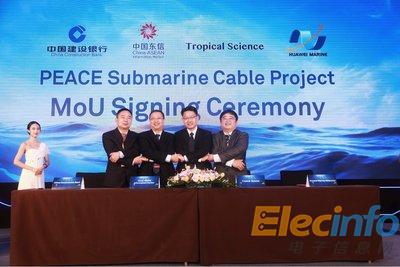 回歸線科學有限公司與中國-東盟信息港股份有限公司在第三屆亞太海纜峰會上正式宣布投資PEACE海纜項目,并且會同中國建設銀行股份有限公司與華為海洋網絡有限公司共同簽署了推進該項目的合作諒解備忘錄(MoU)。