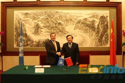 聯(lián)合國開發(fā)計(jì)劃署署長阿奇姆施泰納(左一)和科技部部長萬鋼(右一)在簽約儀式上的合影 圖片:聯(lián)合國開發(fā)計(jì)劃署