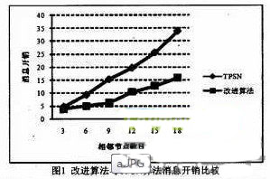 本文提出的改進(jìn)算法比TPSN算法的同步開銷要小得多,并隨相鄰節(jié)點(diǎn)數(shù)的增加,其同步開銷的差別越大。如圖1所示。