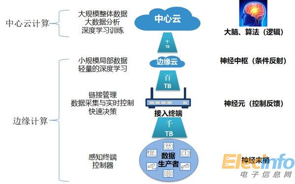 面對龐大的物聯(lián)網(wǎng)節(jié)點數(shù)和海量的數(shù)據(jù)總量,只有通過提升邊緣側(cè)的數(shù)據(jù)計算處理能力才能滿足萬物互聯(lián)的智能化時代的需求。智能化的核心是智能系統(tǒng),智能系統(tǒng)主要由感知系統(tǒng)、決策系統(tǒng)、控制系統(tǒng)、執(zhí)行與反饋系統(tǒng)組成。另外,從支撐智能系統(tǒng)的信息系統(tǒng)角度看,數(shù)據(jù)的存儲、分析、決策也必然是分布式的,而不可能是集中式的,應(yīng)該類似于人的大腦、神經(jīng)中樞、神經(jīng)元、神經(jīng)末梢的分布式架構(gòu),如下圖所示: