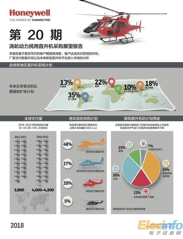 霍尼韋爾航空航天集團美洲區(qū)總裁彭睿仕(Ben Driggs)表示:“預(yù)計未來幾年的全球經(jīng)濟環(huán)境將有所改善,此外,美國稅務(wù)改革對直升機需求具有潛在積極影響,加之石油天然氣市場的波動性降低,這些因素都促使機隊管理者更加堅定其采購直升機的意向。鑒于未來五年全球直升機采購計劃趨于穩(wěn)定,霍尼韋爾將致力于打造互聯(lián)直升機,通過提供發(fā)動機、健康狀態(tài)與使用監(jiān)控系統(tǒng)以及航空電子解決方案,推動直升機的效率和可用性,為運營商的現(xiàn)有和未來機隊帶來更高增值?!?