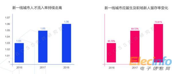 與此同時,以杭州、西安、武漢、成都、南京為代表的15個“新一線”城市在去年陸續(xù)出臺人才吸引政策后,政策已初顯成效。2018年一季度,新一線城市人才流入率(流入人數(shù)/流出人數(shù))為1.07,較2016年增長3.2%。 2018年一季度,從新一線城市高校畢業(yè),之后留在當?shù)毓ぷ鞯穆殘鲂氯吮壤_73.8%(包括應屆生和工作經(jīng)驗一年以下的求職者), 較2016年增加近20個百分點。