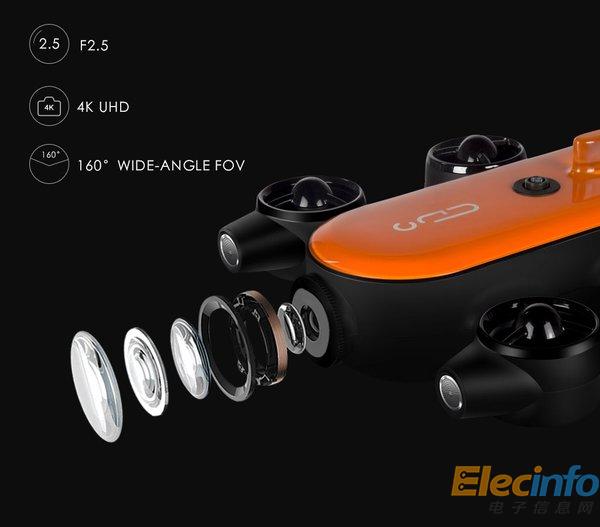 泰坦配備有4K攝像鏡頭,能夠拍攝高清視頻和圖片,前置3000lm LED補(bǔ)光燈,能夠下潛至150米的深海。機(jī)身四周分布有4個(gè)垂直推進(jìn)器和2個(gè)水平推進(jìn)器,使其在水下能夠自由移動(dòng)并保持穩(wěn)定性,可以有效實(shí)現(xiàn)360度全姿態(tài)控制,速度能達(dá)到2m/s。內(nèi)置專用圖像處理DSP,可用于圖像識(shí)別,物體追蹤等智能應(yīng)用。