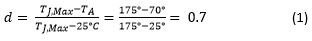 假定環(huán)境溫度為25?C,與在數(shù)據(jù)表上測量SOA的情況相同。由于最終應(yīng)用可能暴露于更熱的環(huán)境中,所以必須按照環(huán)境溫度與FET最大結(jié)溫之比,按比例為SOA降額。例如,最終系統(tǒng)的最高環(huán)境溫度是70?C,可以使用公式1為SOA曲線降額: