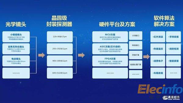 高德紅外“芯”平臺涵蓋了一部完整紅外熱像儀所需要的紅外光學鏡頭、紅外探測器、各種硬件電路、軟件平臺、整機系統(tǒng)設計方案以及應用解決方案,可根據(jù)需求選擇一個或多個部件進行靈活組合。