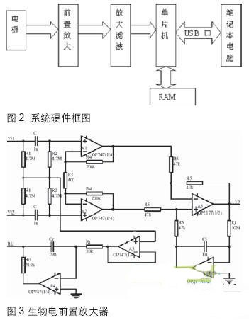 系統(tǒng)硬件框圖如圖2所示,檢測原理是16導(dǎo)聯(lián)EHG信號經(jīng)電極耦合進(jìn)入16導(dǎo)聯(lián)前置放大器后,再經(jīng)放大器放大,濾波網(wǎng)絡(luò)濾波后進(jìn)入模數(shù)轉(zhuǎn)換器。單片機(jī)AduC847以200Hz的采樣率在定時(shí)中斷內(nèi)讀取模數(shù)轉(zhuǎn)換器的輸出,送入RAM中暫存,在定時(shí)中斷外與筆記本電腦進(jìn)行通訊,將RAM中存儲的數(shù)據(jù)不斷經(jīng)串口送入筆記本電腦。筆記本電腦中的應(yīng)用程序由串口接收單片機(jī)發(fā)送的數(shù)據(jù),并對其進(jìn)行數(shù)據(jù)處理和顯示。