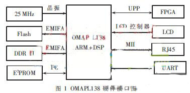 OMAPL138芯片采用C6748內(nèi)核和ARM926EJ-S核,兩個(gè)處理器主頻最高支持到456 MHz。C6748是一個(gè)定點(diǎn)浮點(diǎn)數(shù)字信號(hào)處理器核,它相對(duì)TMS320C6000器件功耗顯著降低,并可實(shí)現(xiàn)代碼兼容。ARM926EJ-S是一個(gè)32 bit精簡(jiǎn)指令集的處理器核,可以執(zhí)行32 bit、16 bit指令集,處理32 bit、16 bit、8 bit數(shù)據(jù)。ARM核有一個(gè)協(xié)處理器CP15,以及8 KB的RAM、64 KB的ROM。接口支持1個(gè)10/100 M以太網(wǎng)接口,DDR2內(nèi)存控制器,1個(gè)EMIFA接口,2套I2C與SPI接口,以及2套McBSP接口等[1]。OMAPL138的硬件連接圖如圖1 所示。
