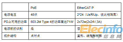 PoE與EtherCAT P之間的另一不同之處在于,PoE只提供一個(gè)48V電源電壓,而EtherCAT P提供兩個(gè)獨(dú)立而又彼此分離的24V電壓軌,如表1所示。就功率而言,PoE可以提供71瓦的功率(對(duì)于803.2bt Type 4來說),而EtherCAT P每個(gè)電壓軌可提供24V x 3A≥72W的功率。