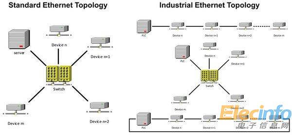 圖 1:兩種類型的以太網(wǎng)拓?fù)浣Y(jié)構(gòu)(左為標(biāo)準(zhǔn)以太網(wǎng)拓?fù)浣Y(jié)構(gòu);右為工業(yè)以太網(wǎng)拓?fù)浣Y(jié)構(gòu))