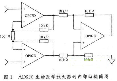為此,選用Analog公司的儀用放大器AD620作為前級放大(預(yù)放)。AD620的核心是三運放電路(相當(dāng)于集成了三個OP07運放),其內(nèi)部結(jié)構(gòu)如圖1所示。