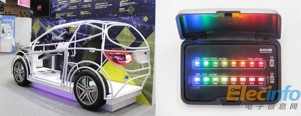 左圖:用來介紹羅姆LED產(chǎn)品優(yōu)勢(shì)的汽車尾燈演示機(jī) 右圖:憑借垂直統(tǒng)合型生產(chǎn)體制的優(yōu)勢(shì),羅姆LED產(chǎn)品陣容強(qiáng)大,色彩豐富