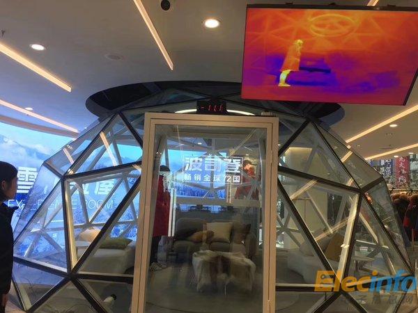 波司登上海旗艦店設(shè)立冰雪體驗屋,制冷后零下十幾度,裝上一臺 Fotric816 實時監(jiān)控屋內(nèi),采用 BNC 模擬信號輸出熱像畫面,工控屏上“冷暖”直觀展現(xiàn)于顧客眼前。因為人體恒溫,衣服保暖性越好,即隔熱性越好,衣服表面溫度越低。穿不同衣服在體驗屋內(nèi)待相同時間,哪件保暖效果好,熱像圖上一看便知。