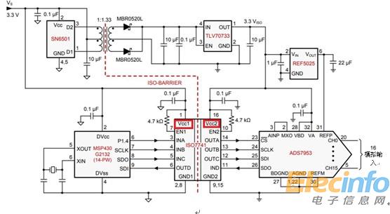 數(shù)字隔離器需要初級(jí)和次級(jí)側(cè)電源。在圖3中,隔離電源為ADC以及連接ADC的數(shù)字隔離器的“場(chǎng)側(cè)”供電。