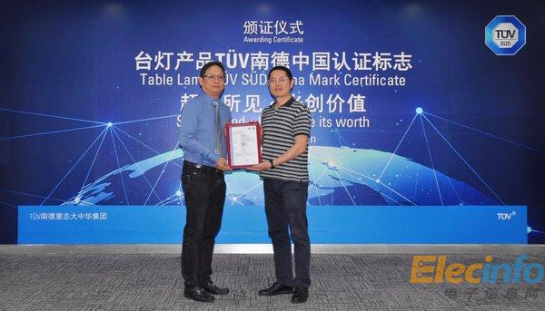 歐普照明臺燈獲TUV南德臺燈類China Mark標(biāo)志