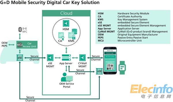 捷德移動安全的數(shù)字車鑰匙解決方案包括DCK服務(wù)器、eSE(嵌入式安全元件)、CyWall和TSM(可信服務(wù)管理):