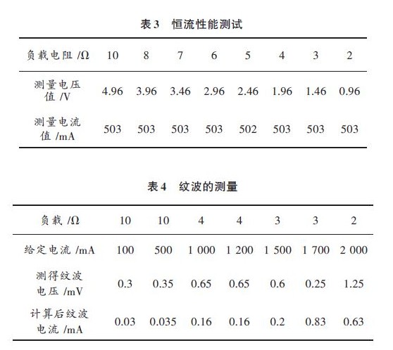 由表3 測試結(jié)果可看出,本系統(tǒng)達到以下的指標:改變負載電阻,輸出電壓在10 V 以內(nèi)變化時,輸出電流變化的絕對值不大于輸出電流值的2%+1 mA;由表4測試可看出,本系統(tǒng)達到了以下的指標:紋波電流≤1 mA.
