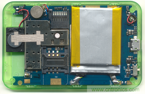 這款手機(jī)內(nèi)部沒(méi)有使用螺絲,各組件是咬合在一起的,基本沒(méi)有連接器,從顯示屏到電池,所有都是直接焊接到電路板上,電池也沒(méi)有二次保護(hù)電路。最主要的兩個(gè)集成電路芯片是聯(lián)發(fā)科MT6250DA和Vanchip VC5276。