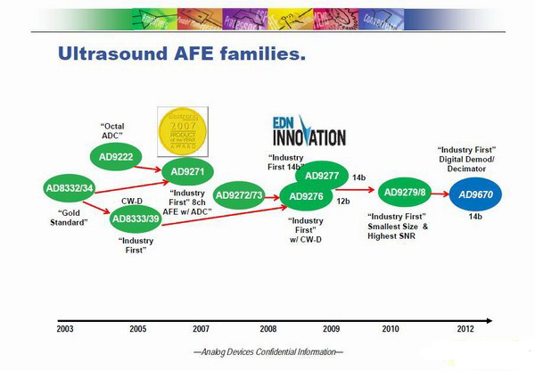 “我們?cè)诔曨I(lǐng)域提供的是線性的解決方案,AD8332/34是我們03年推出的,這也是一款金牌產(chǎn)品,而AD9271是業(yè)內(nèi)第一個(gè)8通道模擬前端,今年7月份,我們又推出了業(yè)界首款片內(nèi)集成數(shù)字I/Q解調(diào)器和抽取濾波器的8通道超聲接收器AD9670。”