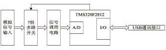數(shù)據(jù)采集系統(tǒng)的結(jié)構(gòu)框圖如圖1所示,主要包括DSP、前置放大電路、信號調(diào)理電路、USB通訊接口,由于三維感應(yīng)測井有3個Z軸向接收線圈和7組三分量接收線圈構(gòu)成,所以采用了7組多路開關(guān)。在一個數(shù)據(jù)采集系統(tǒng)中,A/D轉(zhuǎn)換器是采集系統(tǒng)的核心。在基于TMS320F2812的數(shù)據(jù)采集系統(tǒng)中,選用了芯片嵌入式的ADC模塊。