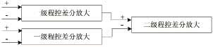 程控放大器是在DSP的控制下,將初級放大的信號放大到ADC的轉(zhuǎn)化區(qū)間內(nèi),以提高儀器的動態(tài)范圍和靈敏度??紤]到器件的低頻噪聲特性和提高共模抑制比等因素,選擇了PGA204、PGA205組合,其共模抑制最高可達(dá)120dB.本設(shè)計采用了兩級程控反向差分的方法,并且兩級程控放大采用直接耦合差動連接的方式。原理如圖3示。