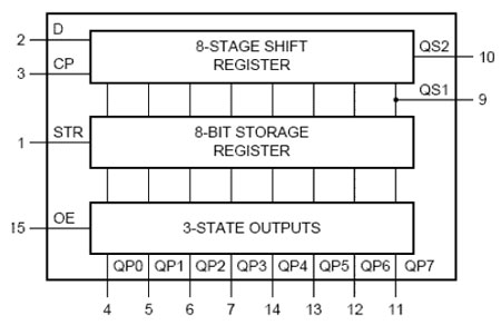 一個(gè)是移位寄存器,另一個(gè)是存儲(chǔ)寄存器。當(dāng)有新數(shù)據(jù)加載至移位寄存器時(shí),存儲(chǔ)寄存器會(huì)將其中保存的數(shù)據(jù)凍結(jié)。當(dāng)所有新數(shù)據(jù)移入后,選通脈沖會(huì)立即將所有數(shù)據(jù)位移至存儲(chǔ)寄存器。這樣,輸出線路就不會(huì)發(fā)生瞬變。這一新特性使該類移位寄存器可以用于驅(qū)動(dòng)瞬變敏感器件,如雙向晶閘管(TRIAC)和高亮LED等。