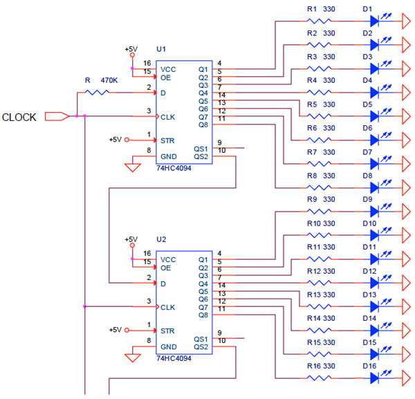 圖3:一個(gè)微控制器端口控制移位寄存器的數(shù)據(jù)和時(shí)鐘輸入。處于未激活狀態(tài)的選通脈沖輸入連接至5V電壓(邏輯1)。