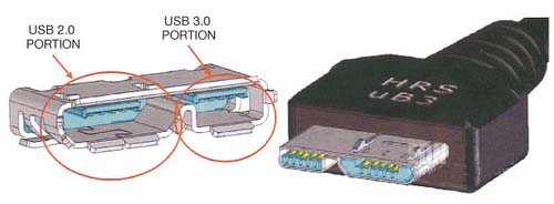 圖1,在USB 3.0微型連接器中,USB 3.0線要通過(guò)USB 2.0連接器。該連接器尺寸大于USB 2.0連接器,從而引發(fā)了移動(dòng)設(shè)備制造商的關(guān)切。