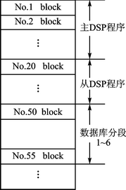 Flash內(nèi)部分為256個block,可以擦寫任意位置的block段,沒有擦寫的block數(shù)據(jù)不會丟失。根據(jù)這一特性,把兩片DSP軟件程序和分段的數(shù)據(jù)庫的燒寫位置分開。Flash空間地址分配如圖2所示。