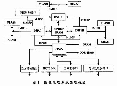 圖像處理系統(tǒng)主要包括DSP及其周邊電路,F(xiàn)PGA電路,四端口存儲(chǔ)器電路、顯示電路、HotLink接口電路等。圖1所示為圖像處理系統(tǒng)的原理框圖。