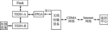 本系統(tǒng)處理數(shù)據(jù)多,計(jì)算量大,又有很強(qiáng)的實(shí)時(shí)性要求,選用ADI公司的高速處理芯片TigerSharc201s。Flash選用JS28F128,容量為256 Mb。系統(tǒng)設(shè)計(jì)采用兩片ADSP并行的模式。系統(tǒng)結(jié)構(gòu)如圖1所示,TS201A為主DSP,TS201B為從DSP。主DSP經(jīng)Flash采用EPROM加載方式,再通過(guò)Link口引導(dǎo)加載從DSP。本處理系統(tǒng)支持多種工作模式,監(jiān)控中心通過(guò)內(nèi)部協(xié)議遠(yuǎn)程管控處理系統(tǒng)。從DSP實(shí)現(xiàn)信號(hào)處理計(jì)算,把處理計(jì)算結(jié)果傳遞給主DSP;主DSP實(shí)現(xiàn)管控模塊,通過(guò)外圍芯片F(xiàn)PGA的串口協(xié)議發(fā)送給無(wú)線傳輸設(shè)備,通過(guò)CDMA模塊用無(wú)線網(wǎng)絡(luò)的形式,發(fā)送到監(jiān)控中心軟件。監(jiān)控中心通過(guò)協(xié)議對(duì)其可實(shí)現(xiàn)遠(yuǎn)程管理,包括數(shù)據(jù)庫(kù)文件更新、程序更新和狀態(tài)模式轉(zhuǎn)換。