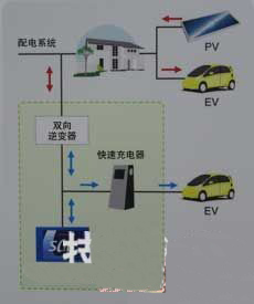 充電網(wǎng)系統(tǒng)由雙向逆變器、鋰離子充電電池及快速充電器構成。電力公司的配電系統(tǒng)與鋰離子充電電池經(jīng)由雙向逆變器連接在一起,快速充電器則與連接二者(鋰離子充電電池與雙向逆變器)的配線相連。