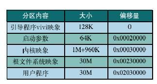 [3]編譯vivi/arch/s3c2410/smdk.c,根據(jù)實際板子的實際情況對NandFlash進行分區(qū)。需要注意的是要和下面Linux內(nèi)核配置編譯配合起來。本開發(fā)板提供的64M的NandFlash做為存儲設(shè)備,其空間分配表如表1所示。