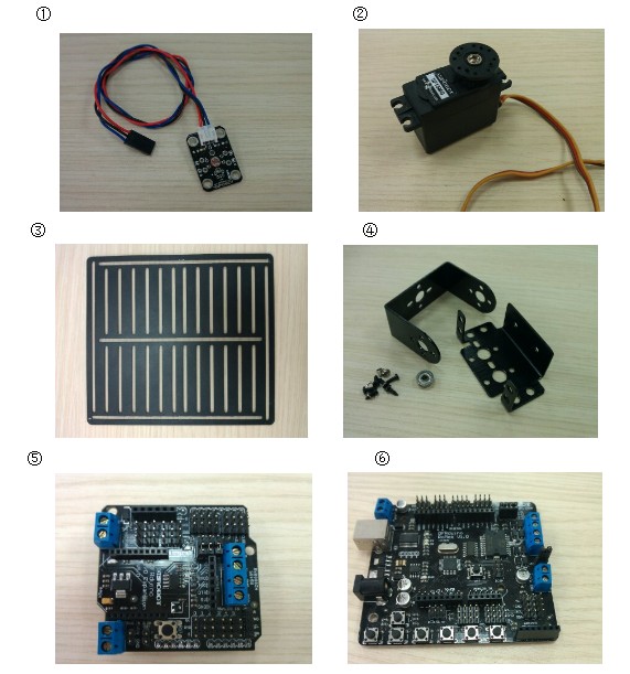 筆者使用DFRobot 的Romeo控制器對(duì)小車(chē)平臺(tái)做直接的電機(jī)控制。首先準(zhǔn)備好制作“向日葵”的材料,這里用到了4個(gè)光線傳感器、2個(gè)舵機(jī)及固定支架、1塊擴(kuò)展板、1塊控制板、1塊多功能固定板、1部Rover 5小車(chē)(將向日葵固定在小車(chē)上,方便全方位監(jiān)測(cè))、1塊太陽(yáng)能板,最后別忘了電源(7~12V)。詳細(xì)信息如表1所示。