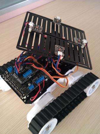6.將DFRduino Romeo 328控制板固定到車(chē)上,然后將傳感器和舵機(jī)的接口導(dǎo)線插到控制板的IO口上。
