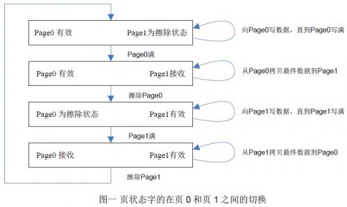 下圖以采用兩個頁模擬EEPROM的方式為例,描述了頁狀態(tài)字的在頁0 和頁1 之間的切換過程。