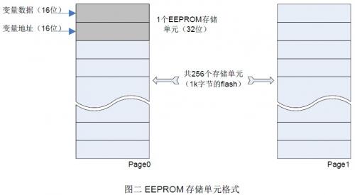 下面的圖例以采用兩個頁模擬EEPROM 的應用方式為例進行描述。為了方便獲取模擬EEPROM數據和更新數據內容,每個存儲變量元素都在Flash 里定義了一個操作單元,在該操作單元中對每個存儲變量元素都分配一個虛擬操作地址,即一個EEPROM 操作單元包含一個虛擬地址單元和一個數據單元。當需要修改數據單元內容時,新的數據內容和之前分配的虛擬地址一同寫入一個新的模擬EEPROM存儲器單元中,同時返回最新修改的數據內容。EEPROM存儲單元格式描述如圖二。