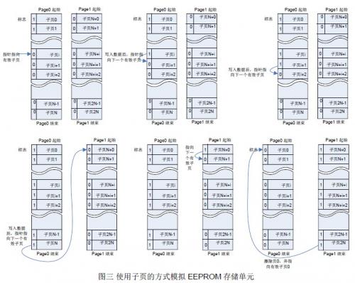 圖三介紹了使用子頁的方式實現Flash 模擬EEPROM的數據處理方法。