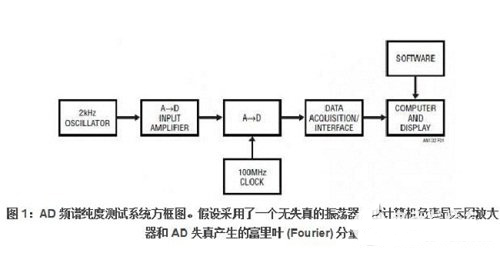 圖 1 給出了系統(tǒng)的示意圖。一個(gè)低失真振蕩器通過(guò)一個(gè)放大器來(lái)驅(qū)動(dòng) AD。AD 輸出接口對(duì)轉(zhuǎn)換器輸出進(jìn)行格式化,并與負(fù)責(zé)執(zhí)行頻譜分析軟件和顯示結(jié)果數(shù)據(jù)的計(jì)算機(jī)進(jìn)行通信。