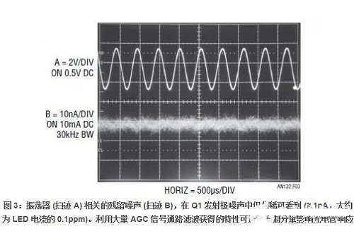 從 LED 偏置中消除與振蕩器有關(guān)的分量是保持低失真的關(guān)鍵。任何此類殘留噪聲都將調(diào)整振蕩器的幅度,因而引入不純分量。對(duì)帶限 AGC 信號(hào)正向通路實(shí)施了很好的濾波,而且 Q1 基極中的大 RC 常數(shù)提供了最終的陡峭滾降。如圖 3 (Q1 的發(fā)射極電流) 所示,振蕩器相關(guān)紋波在 10mA 的總電流中約為 1nA (小于 0.1ppm)。