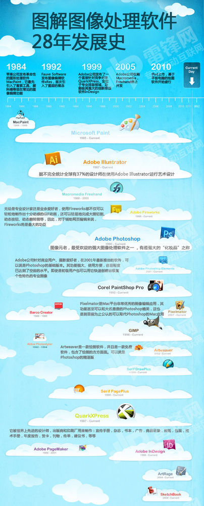 不管是專業(yè)人士還是非專業(yè)人士,相信都有使用過圖像處理軟件的經(jīng)歷,而且有不少人幾乎每天都會使用各種各樣的圖像處理軟件,當(dāng)中最出名的當(dāng)屬有“史上最強(qiáng)化妝品”之稱的Photoshop。除了Photoshop之外,還有很多其他牛掰的圖像處理軟件,設(shè)計(jì)出身的小編也表示聞所未聞,相信很多人和小編一樣,對圖像處理軟件的發(fā)展史知之甚少,歷史上出現(xiàn)過哪些牛掰的圖像處理軟件?它們現(xiàn)在的命運(yùn)又是如何?是像Photoshop一樣經(jīng)久不衰,還是像MacPanit已經(jīng)躺在美國電腦歷史博物館中。通過下面的信息圖表,我們一起來科普一下:
