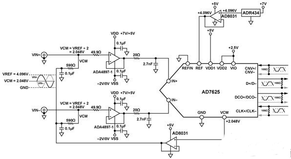 通過使用配置為單位增益緩沖器的 AD8031 來緩沖 AD7625的VCM輸出電壓(標(biāo)稱值為2.048 V),設(shè)置ADA4897-1 輸出端的共模電壓。共模偏置電壓通過590Ω串聯(lián)電阻施加于輸入端。 AD8031非常適合驅(qū)動(dòng)共模電壓,因?yàn)樗哂械洼敵鲎杩?,還可在出現(xiàn)瞬態(tài)電流時(shí)進(jìn)行快速建立。