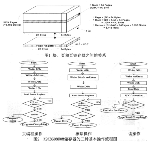K9K8G08UOM儲(chǔ)存器的基本操作由三種類型:讀操作、頁編程操作、擦除操作,其流程圖如圖2所示。