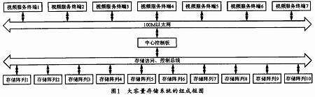 整個(gè)視頻壓縮與大容量數(shù)據(jù)存儲(chǔ)系統(tǒng)一般由多路視頻服務(wù)終端、中心控制分系統(tǒng)、大容量電子存儲(chǔ)陣列等組成。其中,多路視頻服務(wù)終端用于視頻信號(hào)的采集和壓縮,壓縮后的視頻數(shù)據(jù)通過(guò)網(wǎng)絡(luò)送入存儲(chǔ)陣列保存,也可以通過(guò)以太網(wǎng)送到指定的用戶進(jìn)行瀏覽;中心控制分系統(tǒng)以高性能嵌入式處理器BF537為核心,可完成視頻服務(wù)終端的控制,存儲(chǔ)陣列數(shù)據(jù)的讀出。它通過(guò)百兆以太網(wǎng)與上位機(jī)進(jìn)行高速數(shù)據(jù)交換;存儲(chǔ)陣列可提供高達(dá)4T的存儲(chǔ)深度,它由10塊400MByte容量的獨(dú)立存儲(chǔ)板組成,可為多路視頻服務(wù)終端提供同時(shí)存儲(chǔ)服務(wù),存儲(chǔ)介質(zhì)采用大容量非易失NAND-Flash芯片K9WBG08U1M,單片存儲(chǔ)容量為32Gbit,每塊存儲(chǔ)板都可由視頻服務(wù)終端寫(xiě)入,并由中心控制分系統(tǒng)讀出。其系統(tǒng)組成框圖如圖1所示。