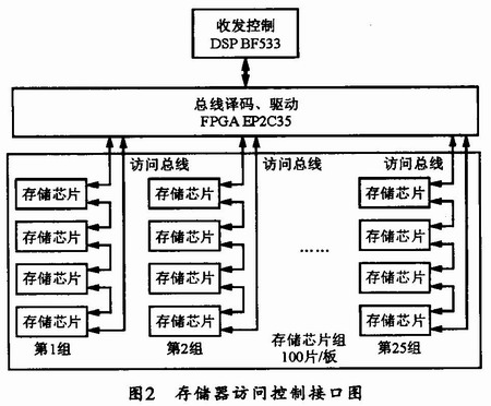 每塊存儲(chǔ)板的訪問(wèn)控制接口均可由兩片F(xiàn)PGA實(shí)現(xiàn)。 由于板上有100片存儲(chǔ)芯片K9WBG08U1M,而輸入/輸出總線只有一套,所以,對(duì)芯片的訪問(wèn)需要通過(guò)總線驅(qū)動(dòng)和譯碼邏輯來(lái)實(shí)現(xiàn)。該邏輯可由ALTERA公司的Cyclong系列FPGA實(shí)現(xiàn),具體型號(hào)為EP2C35F67218,它同時(shí)可通過(guò)EBIU總線與DSP進(jìn)行數(shù)據(jù)交換。存儲(chǔ)芯片寫(xiě)入或讀出的數(shù)據(jù)需通過(guò)EP2C35。由于板上有100片存儲(chǔ)芯片都連接到EP2C35的一套I/O引腳上,故會(huì)導(dǎo)致負(fù)載過(guò)大而無(wú)法工作,所以,可將存儲(chǔ)芯片4個(gè)一組,共用一套EP2C35的I/O引腳驅(qū)動(dòng),以保證足夠的驅(qū)動(dòng)能力。來(lái)自總線的地址信號(hào)輸入到地址譯碼器,用于選擇存儲(chǔ)芯片。輸入為7位地址線,輸出存儲(chǔ)芯片選擇信號(hào)csl~csl00其具體接口連接如圖2所示。