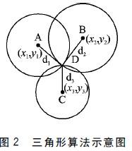 三邊定位法:分別以已知位置的3個(gè)AP為圓心,以各個(gè)到待測標(biāo)簽的距離最近參考標(biāo)簽的距離為半徑作圓。所得的3個(gè)圓的交點(diǎn)為D.三角形算法示意圖如圖2所示。