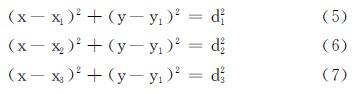 設(shè)位置節(jié)點(diǎn)D(x,y),已知A、B、C三點(diǎn)的坐標(biāo)為(x1,y1),(x2,y2),(x3,y3)。它們到D的距離分別是d1、d2、d3.則D的位置可以通過下列方程中的任意兩個(gè)進(jìn)行求解。