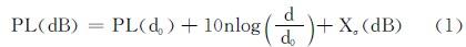 式中:n為路徑損耗指數(shù),與周圍的環(huán)境有關(guān);Xσ是標(biāo)準(zhǔn)差為σ的正態(tài)隨機(jī)變量;d0是參考距離,在室內(nèi)環(huán)境中通常取1 m;PL(d0)為參考位置的信號(hào)強(qiáng)度。