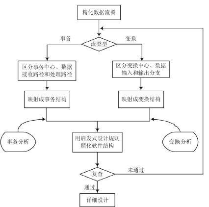 在需求分析階段,用SA方法產(chǎn)生了數(shù)據(jù)流圖。結(jié)構(gòu)化的設(shè)計(jì)能方便地將數(shù)據(jù)流圖(DataFlowDiagram,DFD)轉(zhuǎn)換成軟件結(jié)構(gòu)圖。DFD中從系統(tǒng)的輸入數(shù)據(jù)流到系統(tǒng)的輸出數(shù)據(jù)流的一連串連續(xù)變換形成了一條信息流。根據(jù)數(shù)據(jù)流類型不同,可分為變換型和事務(wù)型2類,事務(wù)型和變換型數(shù)據(jù)流的設(shè)計(jì)步驟基本是大同小異,它們之間主要差別就是從數(shù)據(jù)流圖到軟件結(jié)構(gòu)的映射方法不同。因此,在進(jìn)行軟件結(jié)構(gòu)設(shè)計(jì)時(shí),首先對(duì)數(shù)據(jù)流圖進(jìn)行分析,然后判斷屬于那一種類型,根據(jù)不同的數(shù)據(jù)流類型,通過(guò)一系列映射,把數(shù)據(jù)流程圖轉(zhuǎn)換為軟件結(jié)構(gòu)圖?;玖鞒桃?jiàn)圖1.