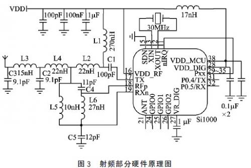 Si1000作為Si10xx系列的成員之一,在極精簡的5 mm×7 mm封裝中結(jié)合了8051內(nèi)核、工作頻段為240~960 MHz高穿透力的EZRadioPRO RF收發(fā)器、64 KB的Flash和10位ADC.Si1000系列提供優(yōu)越的RF性能,具有最高輸出功率、接收靈敏度以及最低功耗的喚醒轉(zhuǎn)換等特性。該無線微控制器在工作模式下有最低的電流消耗(160μ/MHz),在休眠模式下,以內(nèi)部低頻振蕩器(LFO)作為頻率源的RTC工作時,消耗電流低至315nA.在深度休眠模式下,僅需25 nA工作電流,且不會丟失RAM數(shù)據(jù)。圖3給出了射頻部分硬件原理圖。